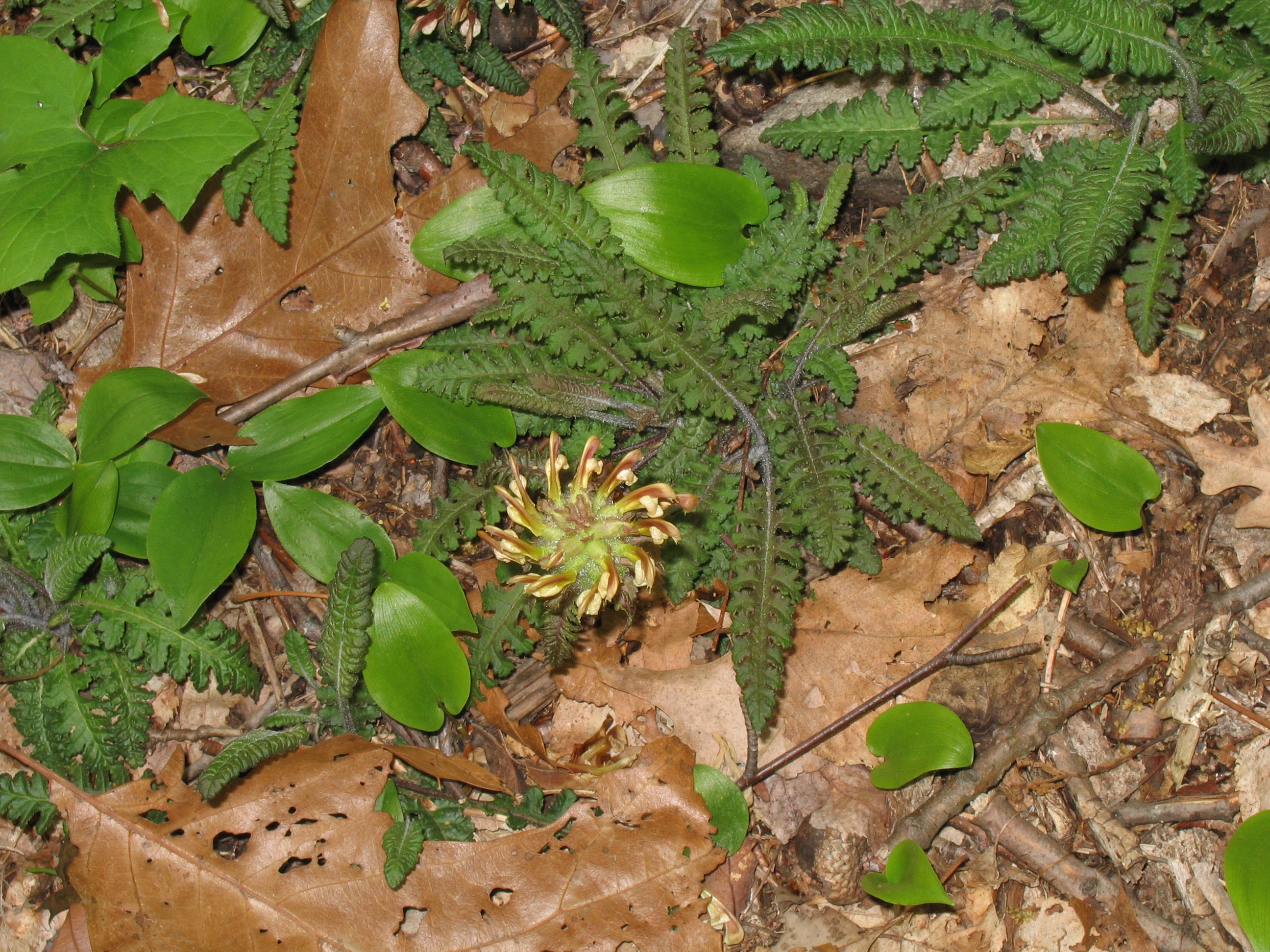 An upper view of a wood-betony inflorescence. Flowers in this genus have a rather unusual structure with the upper lip hooded and incurved, featuring two teeth protruding from under the apex and lower lip shifted asymmetrically to the side.