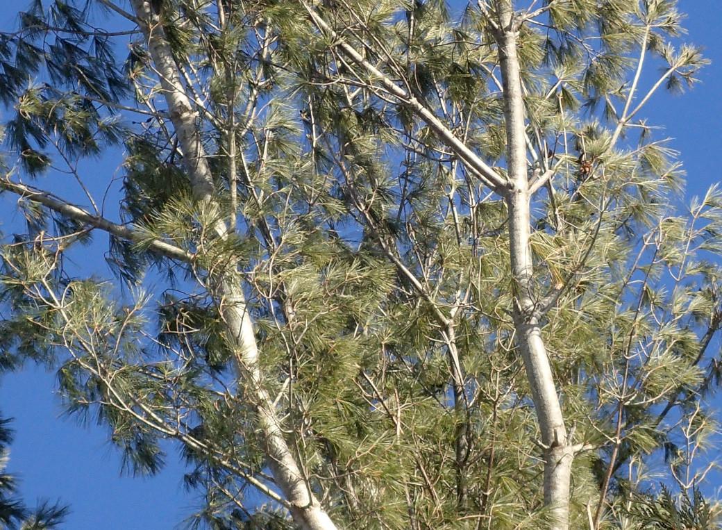 View of upper branches from underneath. This light silvery bark may provide the explanation of the name "white pine."